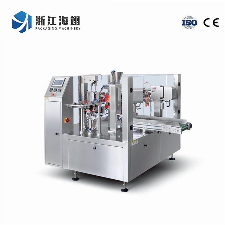 Manje Pouch anbalaj machin lan se yon ekipman entegre konplètman otomatize pou fè sak, mesure, ranpli, ak sele nan poud manje, granules, likid, ak sòs.